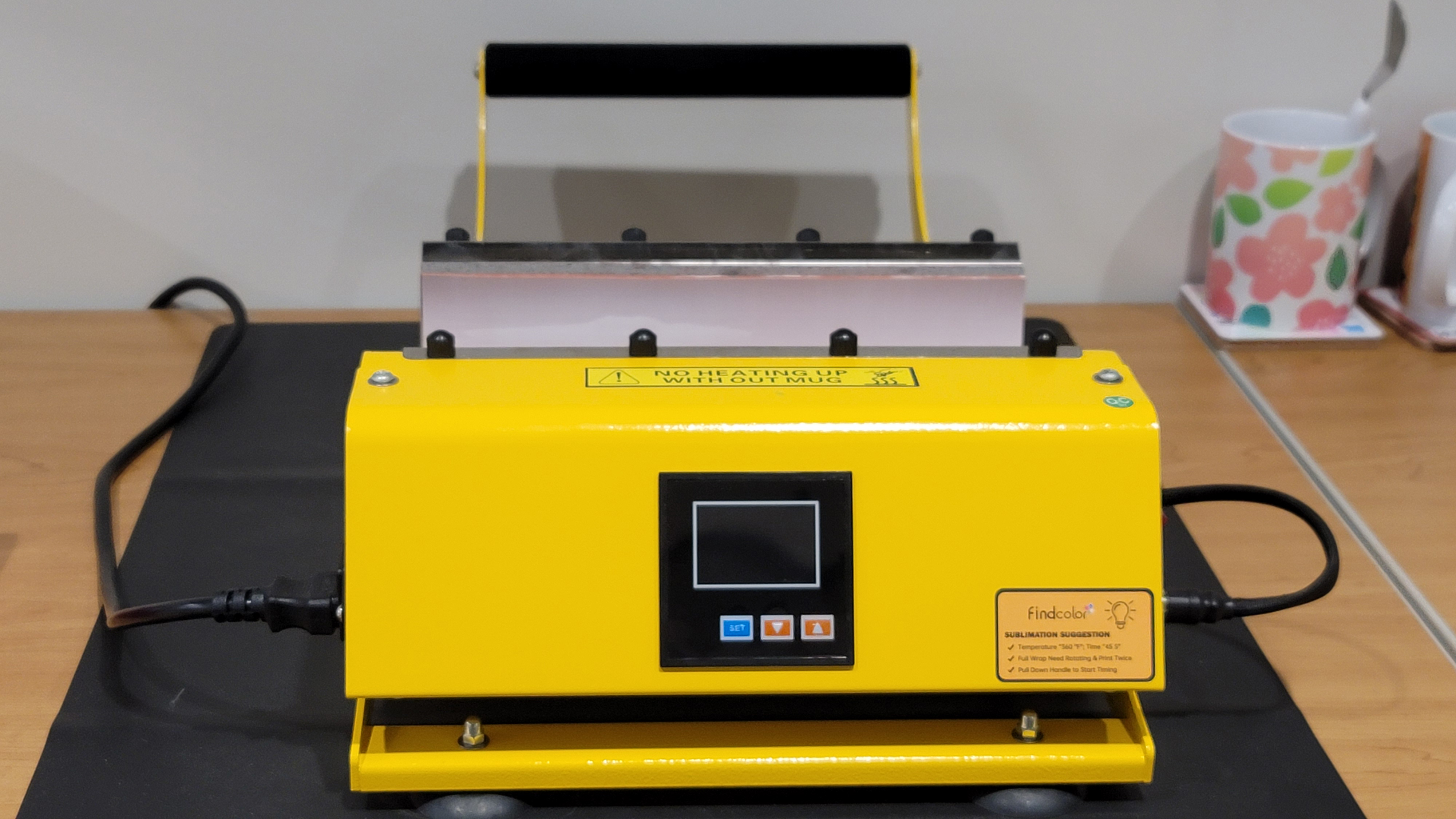 The mug press transfers printed sublimation materials onto rounded sublimation-ready products like mugs and thermoses. Max dimensions: 10" x 4". Make An Appointment